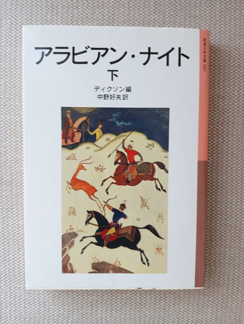前回紹介した「アラビアン・ナイト 上」の続きの巻です。この本には「シナの王女」「魔法の馬」「ものいう鳥」「アリ・ババと四十人の盗賊」など、六編が収められています。その中の、「魔法の馬」を紹介したいと思います。